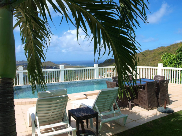 The residence itself is a masterpiece of classic St. Lucian design, featuring an airy open floor plan and high vaulted ceilings that create an inviting atmosphere throughout. The main floor includes two comfortable bedrooms that share a well-appointed bathroom. The upstairs master suite boasts an en-suite bathroom and a private balcony that overlooks the pool terrace, offering stunning views of both the ocean and surrounding landscape.
