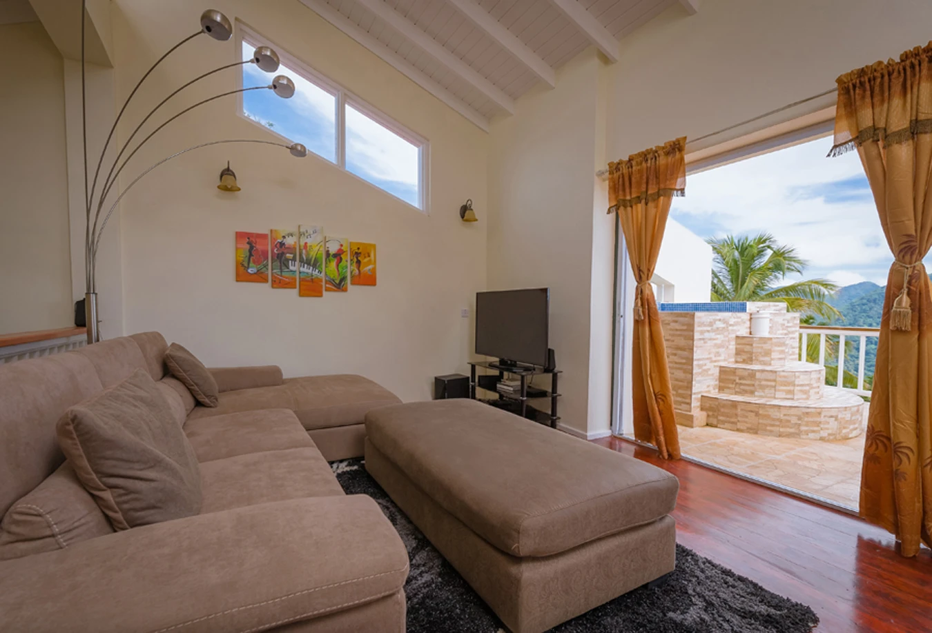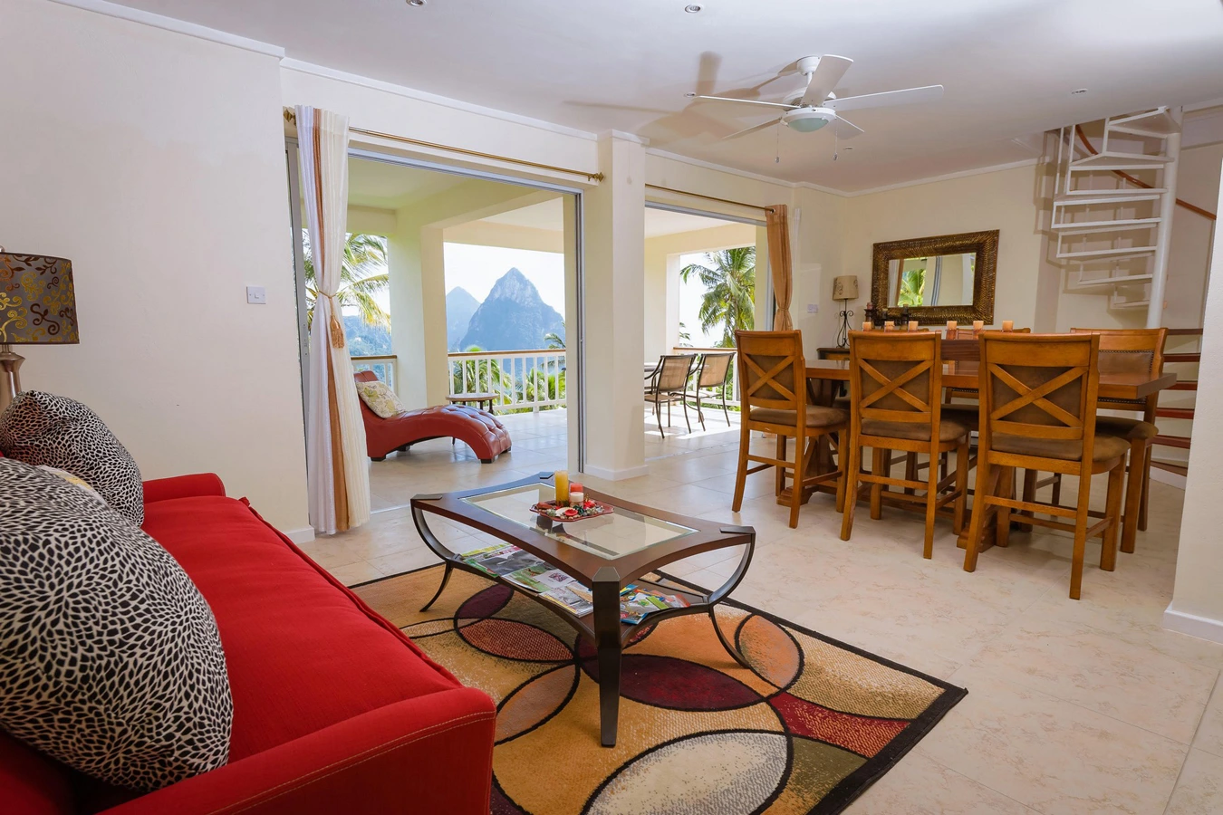 - A spacious living room opens onto a large balcony, perfect for taking in panoramic views of the Pitons and surrounding forested hills.