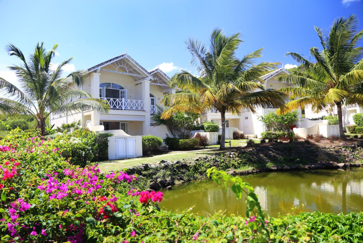 Beautiful condo in Villas on the Green, luxury gated community, overlooking the greens of the St. Lucia Golf Course. The 2-story villa dubbed ’Little Landmark’ is bright and spacious, 1440 square feet, with plenty of room for 4 people to relax and play. Awaiting you is a fully-equipped modern kitchen, colorful locally-made furniture, private patio with splash pool, large communal pool—and, of course, beautiful beaches! There are 2 roomy bedrooms, The master with a queen bed and The guest room with two double beds., each with its own full bathroom and AC.